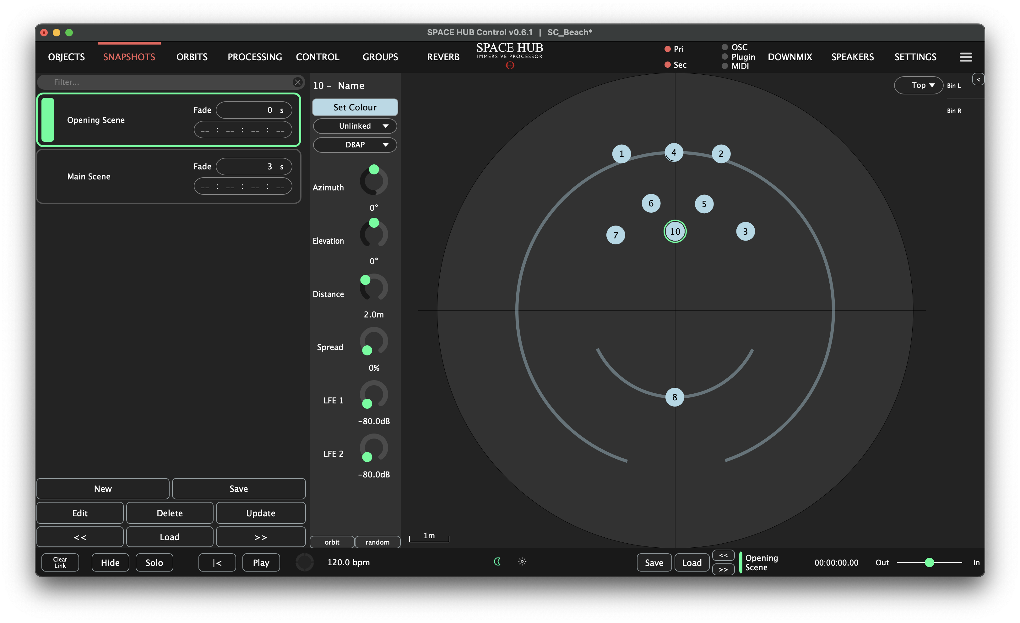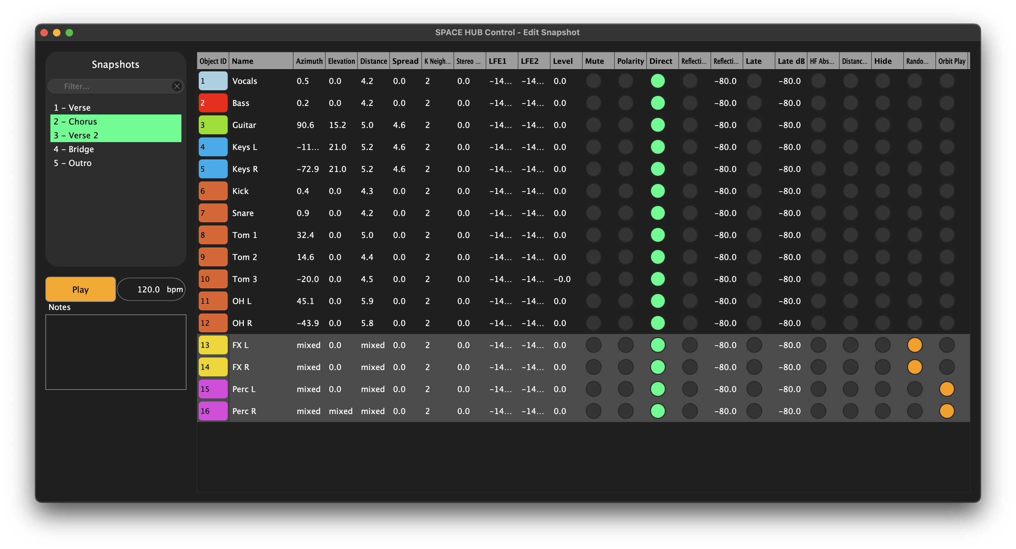 The Snapshot View exchanges the Object list on the left side of the Workspace for a Snapshot list. The currently selected Snapshot is marked with a green frame, while the currently active Snapshot has a green bar on its left. Snapshots can be renamed by double-clicking their name in the list. Right-click on the name to either duplicate the snapshot, or write notes about the snapshot. The Fade time and Timecode for each individual Snapshot can be edited in this view. Snapshots include Hide, Processing (Speaker Lock, Distance Gain, HF Absortion), Reverb Sends and the exact positions of Objects.
