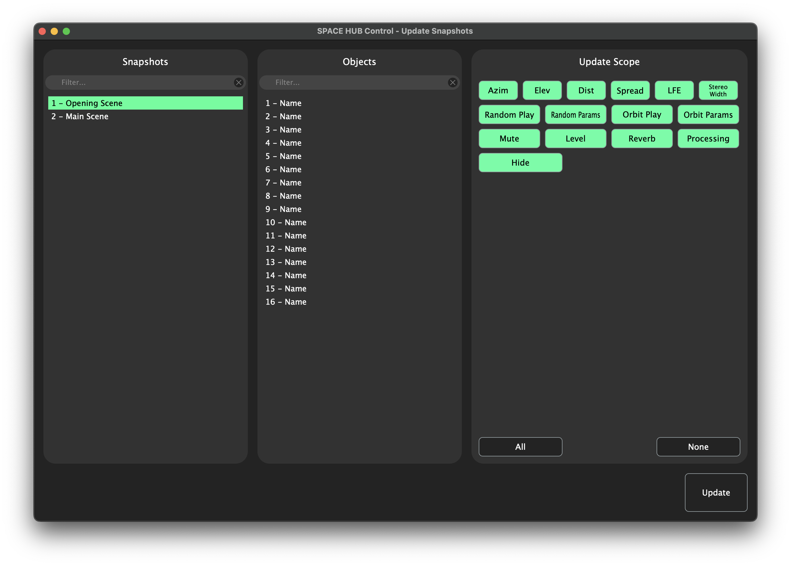 The “Update”-Window is divided up into three columns. At first you can choose which Snapshot should be updated. By holding Shift for consecutive or Cmd on Mac or CTRL on Windows for non-consecutive selection you can choose multiple Snapshots. The middle column is build for the Objects you want to include in your Update. To select more than one Object you have to press and hold Cmd/ CTRL again. In the scope-column you can choose which parameters should be updated. The Box of selected parameters is green with black scripture, the Boxes of unselected parameters are transparent/ white. Per default no Objects and all parameters are selected.